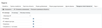Чтобы сохранить новые настройки матрицы передачи ответственности между командами, нажмите кнопку Сохранить. Карточка класса/типа объектов обновится. При изменении ответственного будут отображаться только те команды, в которые допустима передача ответственности из команды текущего ответственного.