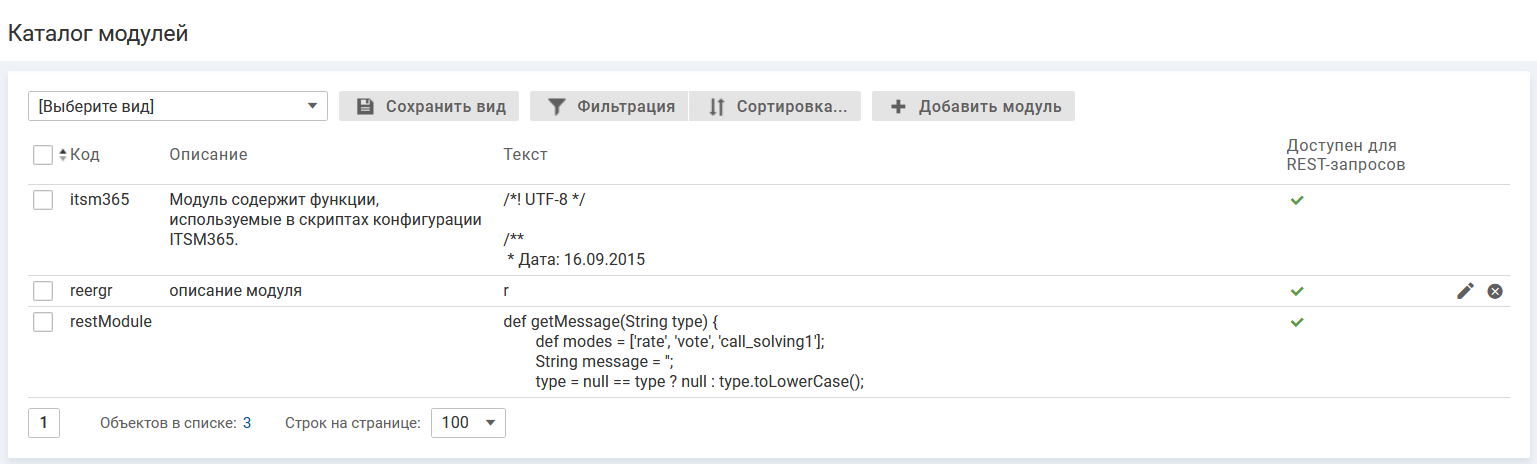 Каталог модулей используется для настройки скриптовых модулей. В каталог входят модули, добавленные пользователем и модули, представленные клиентским сервисом ITSM 365.