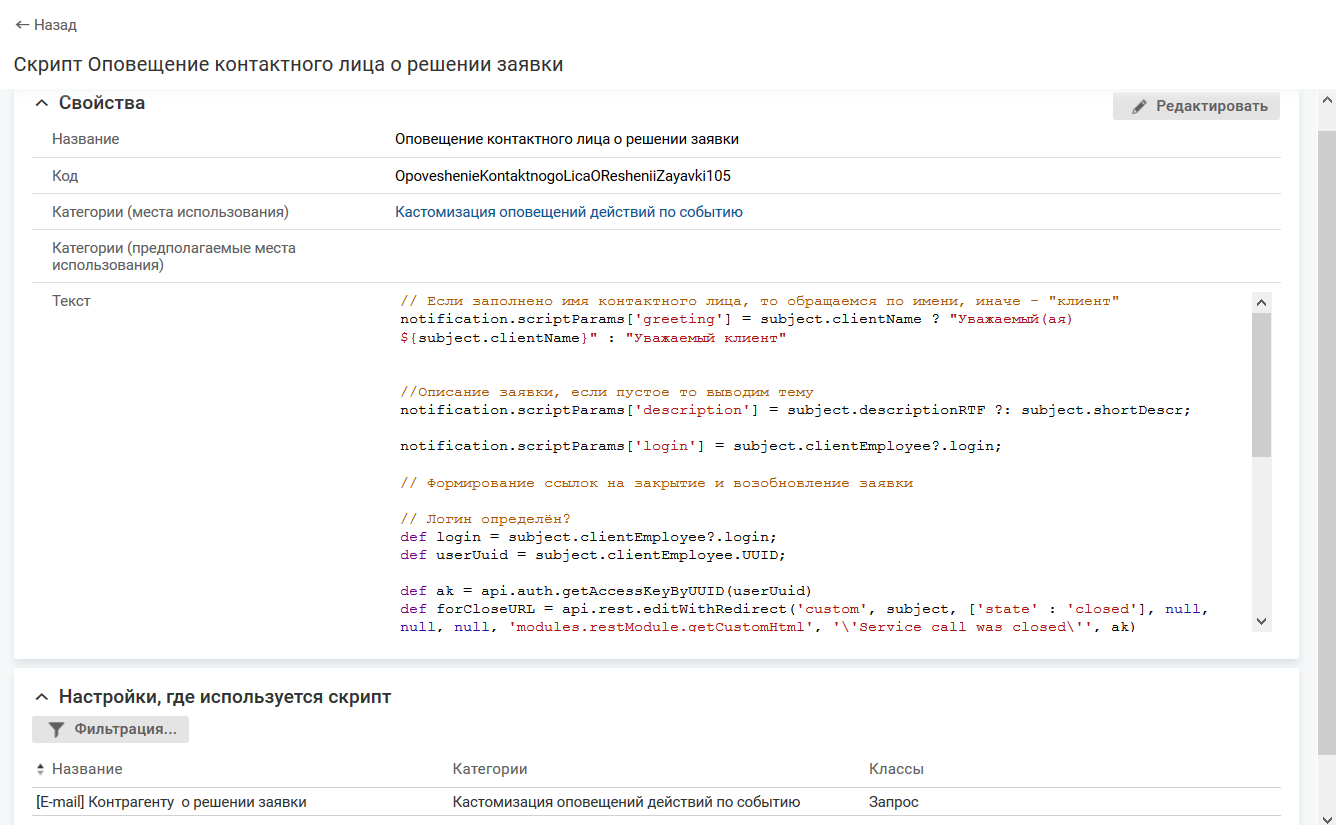 в строке с описанием скрипта. - В карточке скрипта нажмите кнопку Редактировать.