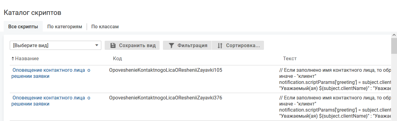 - "Все скрипты" — на вкладке отображается список всех существующих в системе скриптов.