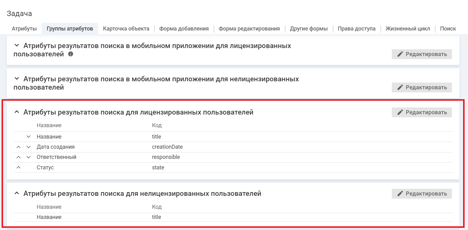 - "Атрибуты результатов поиска для нелицензированных пользователей" — используется для отображения результатов быстрого поиска для нелицензированных пользователей.