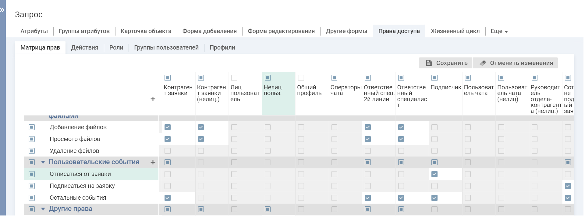 Настройте право доступа в матрице прав — установите флажок на пересечении маркера прав и профиля пользователя.