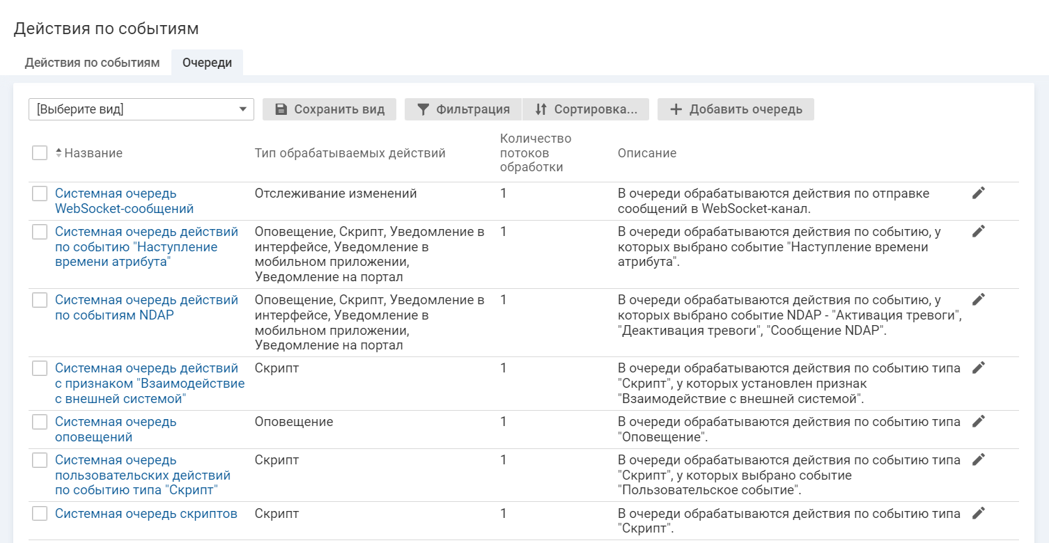 Для каждой очереди обработки действий по событиям в списке отображаются: