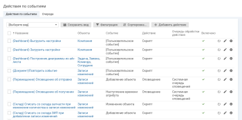 Все действия по событиям, настроенные в системе, отображаются в списке действий по событиям.