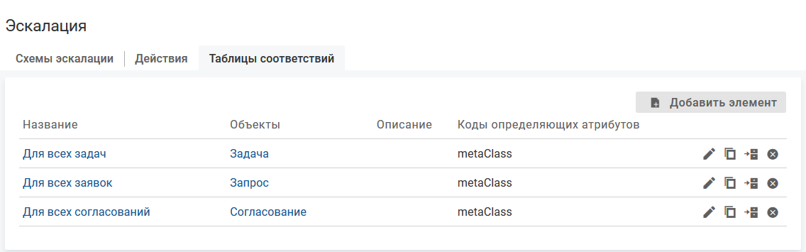 Редактирование и удаление правил определения схемы эскалации производится также как в справочнике "Таблицы соответствий", с учетом особенностей настройки таблицы соответствий для схемы эскалации, см. Справочник "Таблицы соответствий".