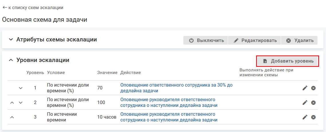Для каждой схемы эскалации настраиваются уровни эскалации.