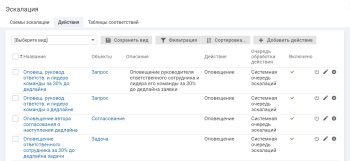 Список действий, возможных при эскалации, настраивается в разделе настройки "Эскалация", на отдельной вкладке. Затем конкретное действие выбирается при настройке уровня схемы эскалации, см. Настройка уровней схемы эскалации.