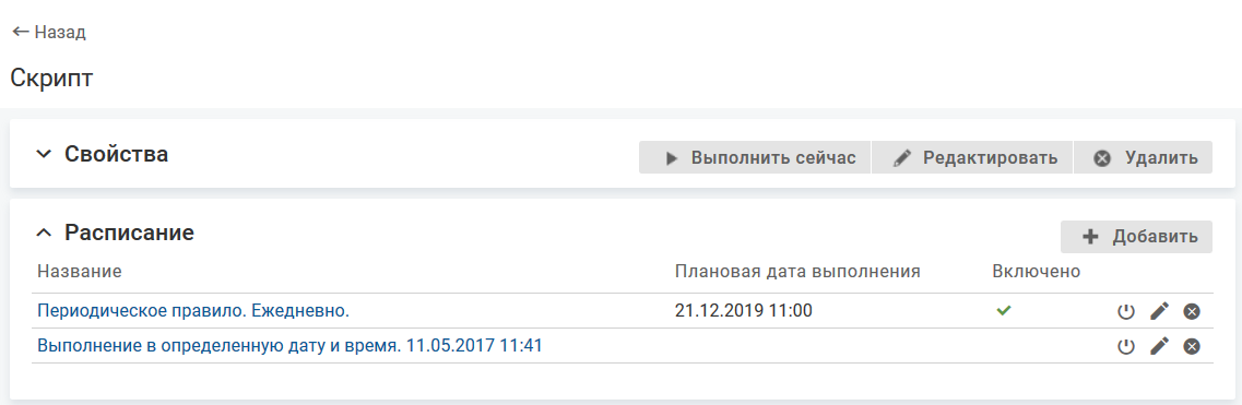 Форма добавления закроется, правило отобразится в блоке "Расписание" карточки задачи планировщика. Новое правило создается в состоянии "включено".