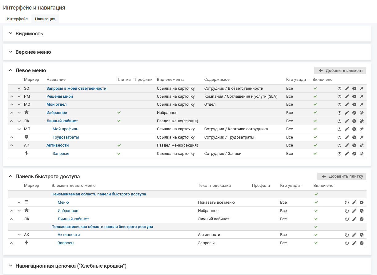 Флажок в столбце "Плитка" означает, что для элемента меню уже создана плитка на панели быстрого доступа.