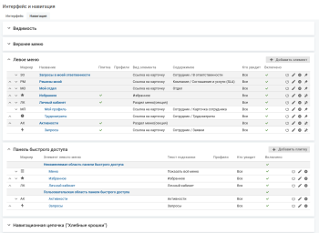 В блоке "Левое меню" нажмите иконку в строке элемента. На форме "Редактирование элемента меню" измените параметры элемента меню (параметр "Вид элемента" не редактируется) и нажмите кнопку Сохранить.
