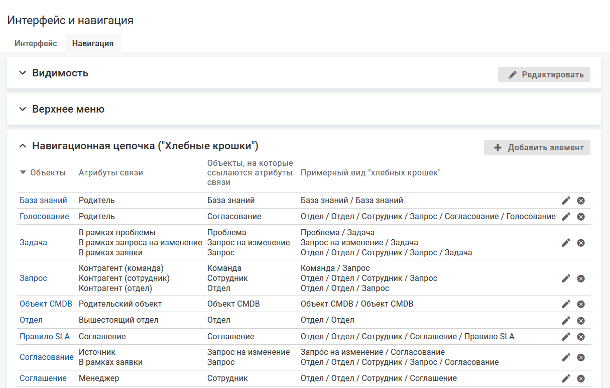 Чтобы открыть карточку элемента "хлебных крошек", в блоке "Навигационная цепочка ("Хлебные крошки")" нажмите на название объекта в столбце "Объекты".