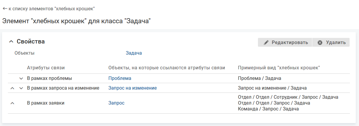 • Примерный вид "хлебных крошек" — пример цепочки "хлебных крошек" для класса, заданного в столбце "Объекты". Для каждого атрибута связи отображается по одному примеру, все возможные примеры навигационных цепочек отображаются в карточке элемента "хлебных крошек".