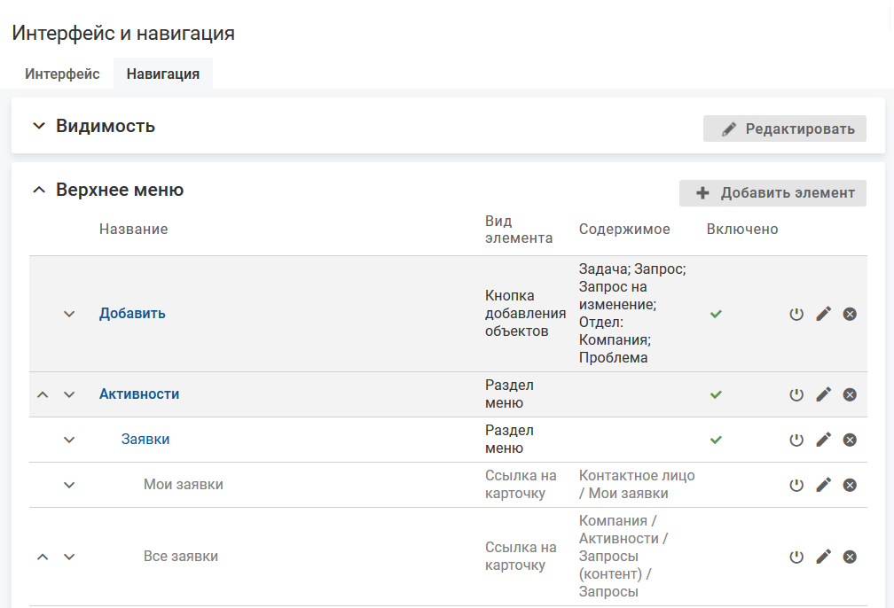 Элемент верхнего меню отображается в интерфейсе оператора, если включен флажок "Показывать верхнее меню" и активирован (включен) сам элемент верхнего меню. Если настройки элемента верхнего меню изменяются в рамках одной сессии пользователя, то чтобы изменения отобразились в интерфейсе оператора пользователю необходимо перелогиниться в системе.