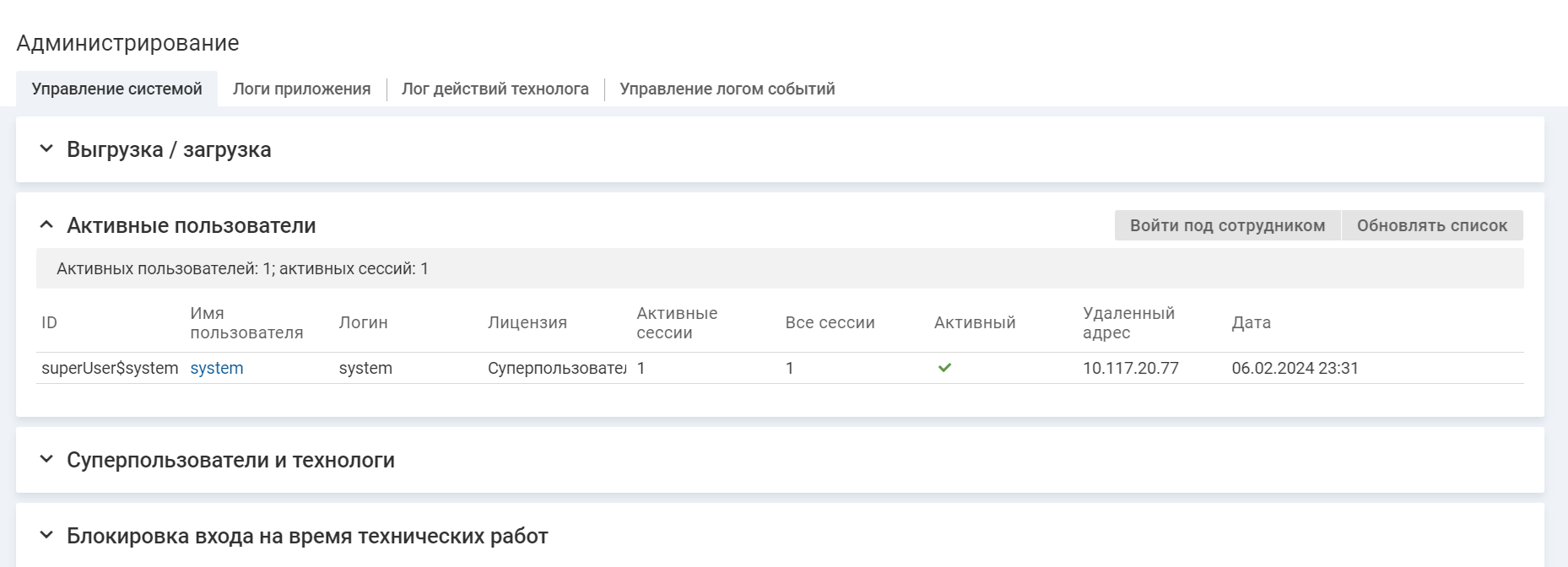 Активная сессия выбранного сотрудника при входе суперпользователя будет прервана. На экране суперпользователя откроется домашняя страница выбранного сотрудника.